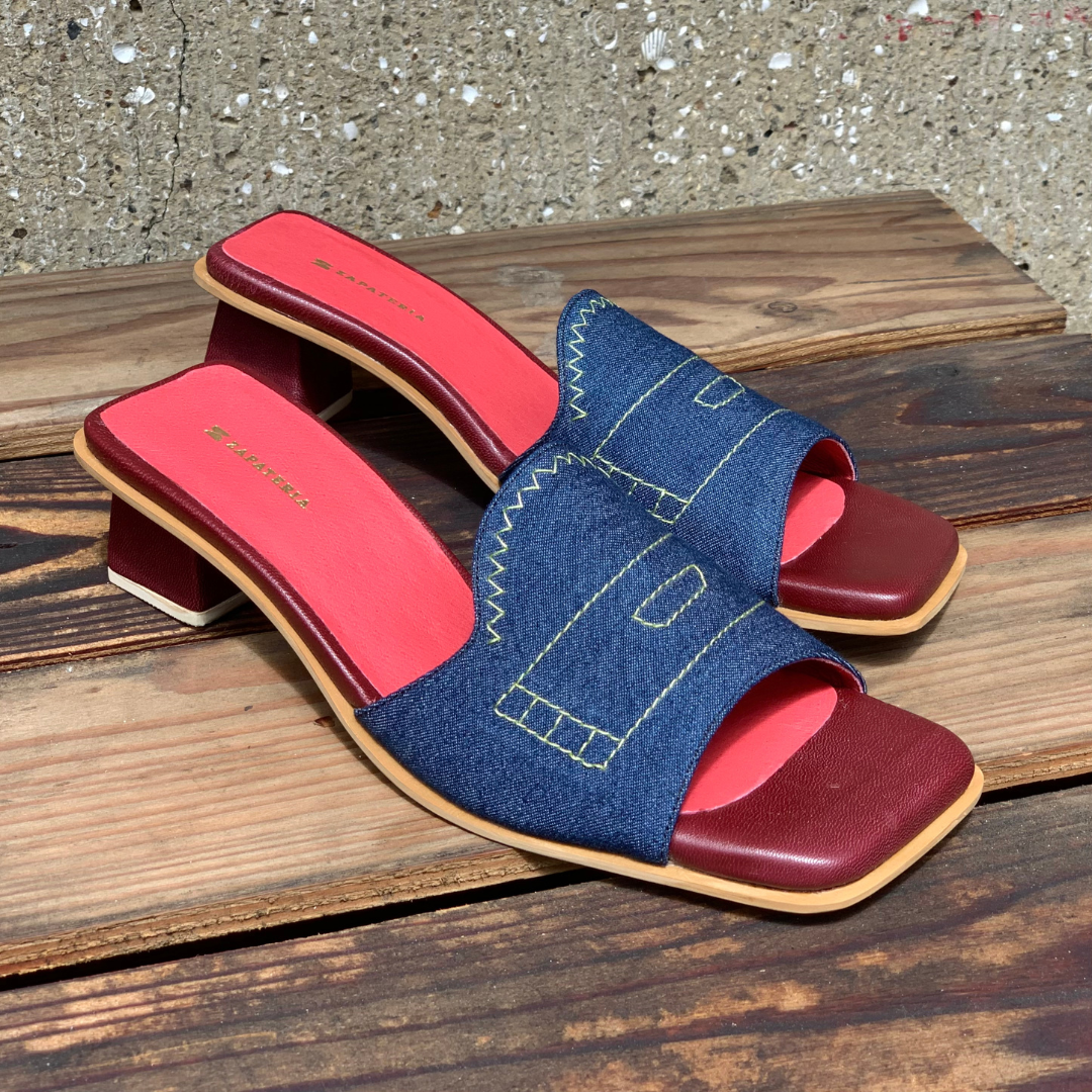 Open-toed sandals with a 1.5-inch heel, featuring denim straps and a stitched "penny slot" detail, bringing comfort and style to your everyday look.