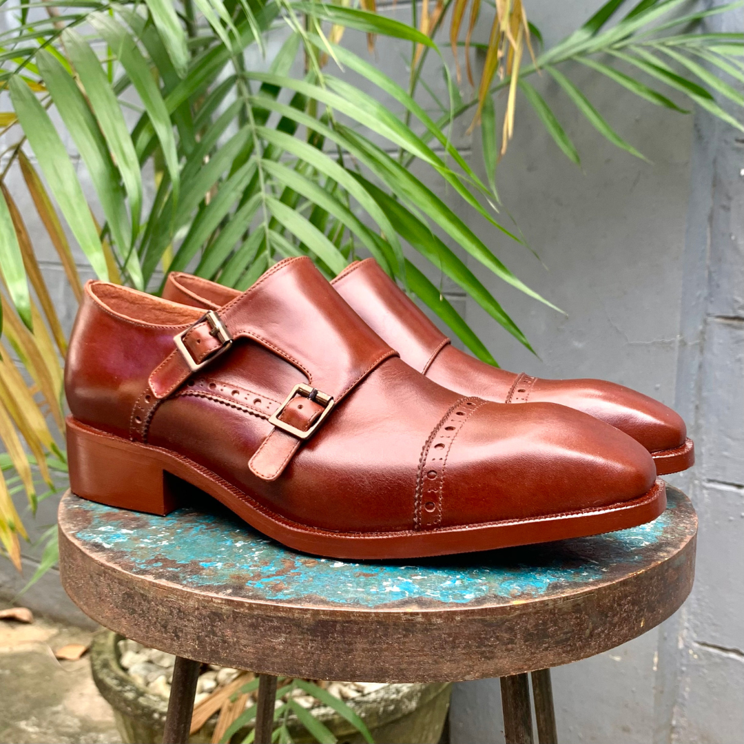 Sleek french toe silhouette for a double monk strap handcrafted footwear.