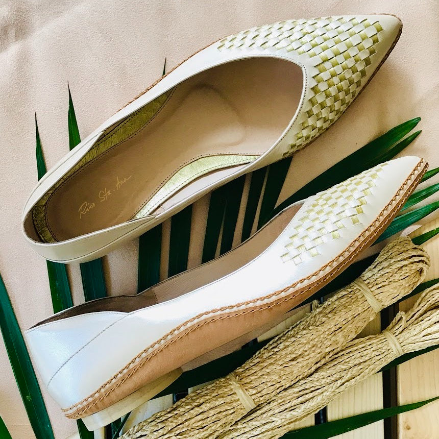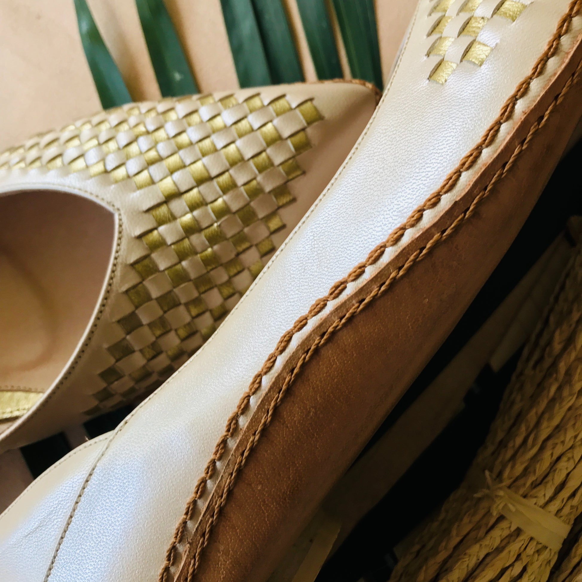 Leonor in pealized white with gold leather weaving is available for Pre-Order and Made-To-Order.