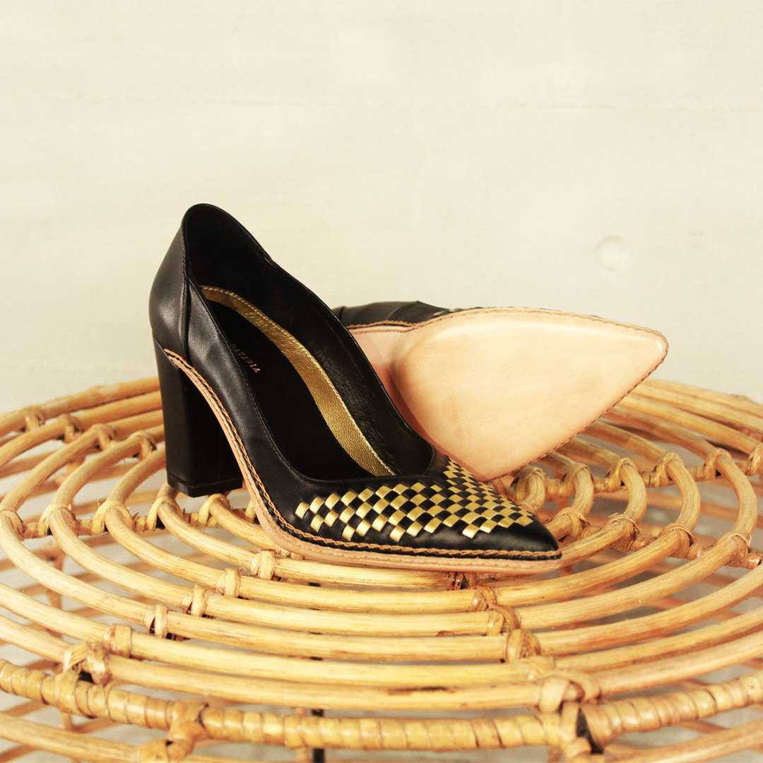 Pearlized white with gold woven leather placed atop a 3 inch heel. Genuine leather soles are secured by the intricate and delicately handmade "mokmok", a signature of the Sta. Ana family, also known as the On-the-Last skin stitching method.